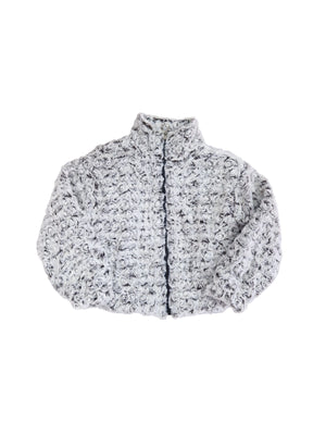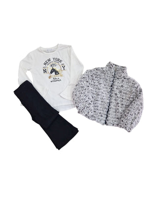 UN OUTFIT PRATICO E SUPER TRENDY PERFETTO PER LE GIORNATE PIÙ FRESCHE! UNISCE COMFORT E STILE GRAZIE AI SUOI TRE CAPI COORDINATI. MAGLIA A MANICHE LUNGHE IN COTONE CON STAMPA, PANTALONE A ZAMPA NERO IN VELLUTO, GIACCA IN PELLICCIA GRIGIA EFFETTO RICCIOLINO, CALDA E MORBIDISSIMA AL TATTO, CON CHIUSURA FRONTALE ZIP. DISPONIBILE DALLA 3 ALLA 7 ANNI.