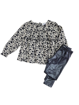UN LOOK MODERNO E RAFFINATO, QUESTO COMPLETO DA BAMBINA UNISCE ELEGANZA E PRATICITÀ, IDEALE PER OGNI OCCASIONE. BLUSA A MANICHE LUNGHE IN TESSUTO FELPA CON STAMPA FLOREALE BIANCO SU FONDO NERO, LEGGINGS IN ECOPELLE NERO CON VITA ELASTICIZZATA. DISPONIBILE DALLA 3 ANNI ALLA 7 ANNI