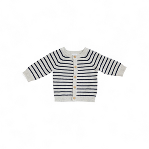 DELIZIOSO CARDIGAN LAVORATO A MAGLIA PER NEONATO, CARATTERIZZATO DA UNO STILE CLASSICO E SENZA TEMPO. UNA BASE GRIGIO CHIARO CON SOTTILI RIGHE BLU CHE CORRONO LUNGO TUTTO IL CORPO E SULLE MANICHE. FILA CENTRALE DI CINQUE BOTTONI IN LEGNO CHE AGGIUNGONO UN TOCCO RUSTICO AL CAPO. IL GIROCOLLO, I POLSINI E IL BORDO INFERIORE SONO RIFINITI A COSTINE, GARANTENDO UNA VESTIBILITÀ COMODA CHE MANTIENE LA FORMA. COMPOSIZIONE 100% COTONE. DISPONIBILE DALLA 1 ALLA 18 MESI.