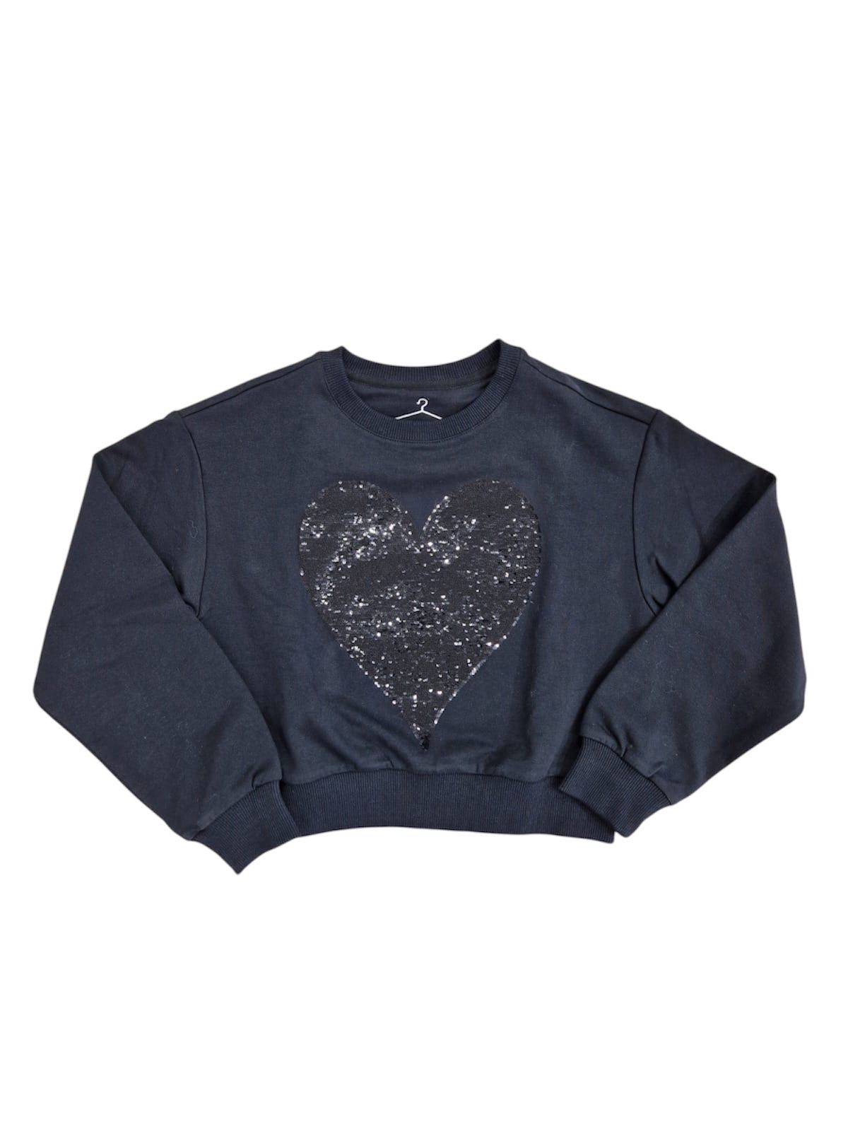 QUESTA FELPA CROP NERA UNISCE COMFORT E STILE GRAZIE AL SUO TAGLIO MODERNO E AL MORBIDO TESSUTO EFFETTO FELPATO. IL GRANDE CUORE FRONTALE REALIZZATO INTERAMENTE IN PAILLETTES DONA UN TOCCO LUMINOSO E TRENDY, PERFETTO PER CHI AMA I DETTAGLI SCINTILLANTI. IL GIROCOLLO, I POLSINI ELASTICIZZATI E IL BORDO A COSTINE ASSICURANO UNA VESTIBILITÀ COMODA E STABILE. IDEALE PER UN OUTFIT CASUAL CON UN ACCENTO FASHION, DA ABBINARE A JEANS, JOGGERS O GONNE. COMPOSIZIONE 95% COTONE, 5% ELASTAN. DISPONIBILE DALLA 8 ANNI ALLA 16 ANNI.